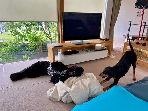 デッキテラスで寛いでいると、通りすがりのくろすけが立ち寄ってくれ、エクストラのもう一遊び。
