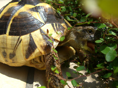朝、ヴェランダに出してみたのだがあまりの暑さのためか、まったく日向に出ることなく陰でジッとしている。