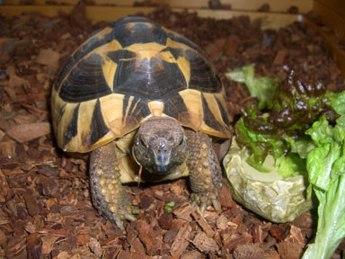 葉っぱを盛った餌皿を置いたらムックリと床材から這い出てきて、すぐに食べ始めた。