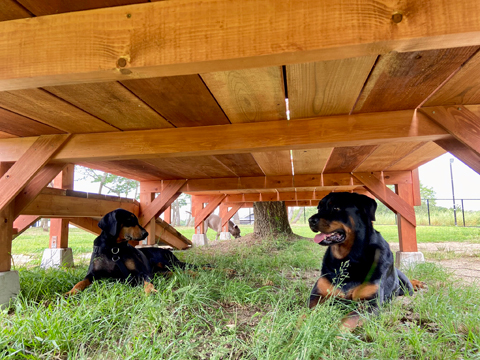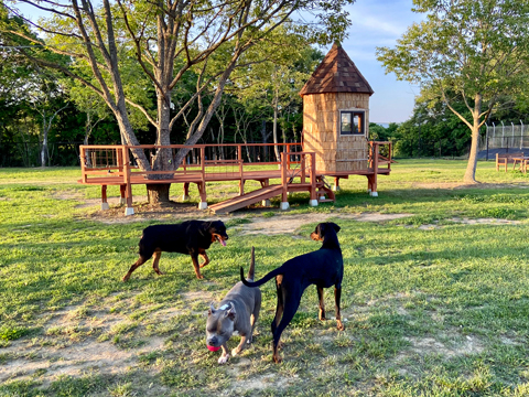 施設全体の印象として、とにかくワンコファーストで、まず敷地の大部分を占める天然芝のドッグランは広大かつ遊びどころが満載、1組で使うにはあまりにもったいない。